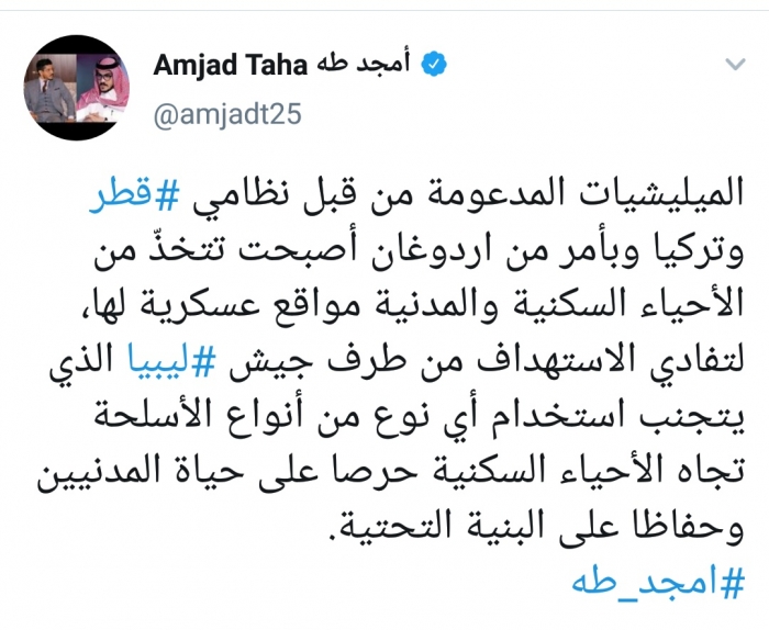 أمجد طه الميليشيات الإرهابية في ليبيا تتخذ من الأحياء السكنية مواقعا عسكرية لها