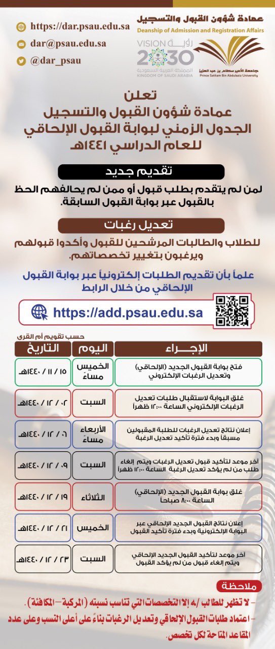 عمادة القبول والتسجيل On Twitter إعلان فتح بوابة القبول الإلحاقي تقديم جديد تعديل رغبات يوم الخميس 15 11 1440هـ تفاصيل الإعلان Https T Co Ez3f8fmwsf بوابة التقديم Https T Co Ahqihl4rzg جامعة الأمير سطام Https T Co Nigbfsggth