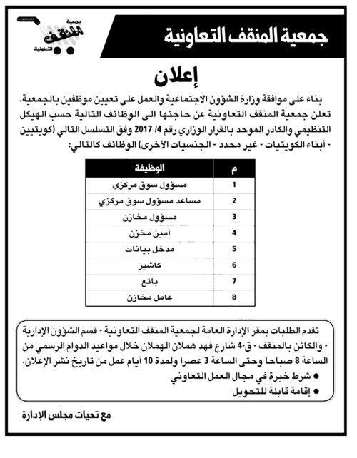 هام جدا وظائف شاغرة فى جمعية المنقف التعاونية Jobs Kuwait Salary Jobs In Kuwait وظائف الكويت اعلانات وظائف الكويت وظائف الكويت فرص عمل في الكويت