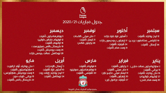 جدول مباريات ليفربول فى الدورى الانجليزي الموسم الجديد 2020 2021 Youtube